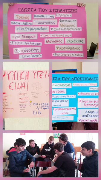 Ακολούθησε μία βιωματική άσκηση, όπου τα παιδιά χωρίστηκαν σε ομάδες και εξέφρασαν πότε νιώθουν αρνητικά συναισθήματα και με ποιο τρόπο τα αντιμετωπίζουν. Στη συνέχεια αποτύπωσαν σε μεγάλα χαρτόνια τις απαντήσεις τους καθώς και τι είναι Ψυχική Υγεία.