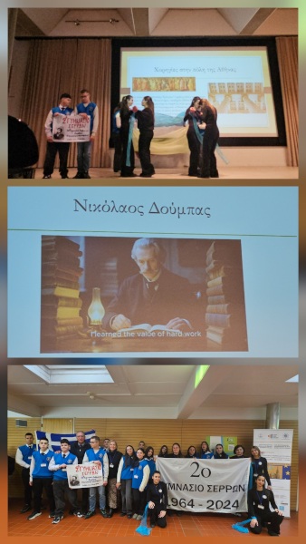 Η μαθητική ομάδα παρουσίασε την εργασία με θέμα: «Η κοινωνική και φιλανθρωπική συνεισφορά της οικογένειας Ν. Δούμπα στην Αυστρία», αφού μελέτησε την ιστορία της οικογένειας των Ελλήνων ευεργετών, η οποία είναι στενά συνδεδεμένη και με την ιστορία της πόλης των Σερρών. Πιο συγκεκριμένα κατασκεύασαν ένα διαδραστικό οδοιπορικό στον χρόνο και στις πόλεις από τη Βλάστη, τη Σέρρες και τη Βιέννη ακολουθώντας την πορεία και το έργο προσφοράς της οικογένειας του Ν. Δούμπα. Τέλος έκλεισαν την παρουσίαση τους με ένα χορευτικό δρώμενο, όπου χόρεψαν βάλς τιμώντας τον σπουδαίο άνθρωπο των τεχνών και του πολιτισμού μα την ιδιαίτερη αγάπη για τη μουσική και τους μουσικούς.